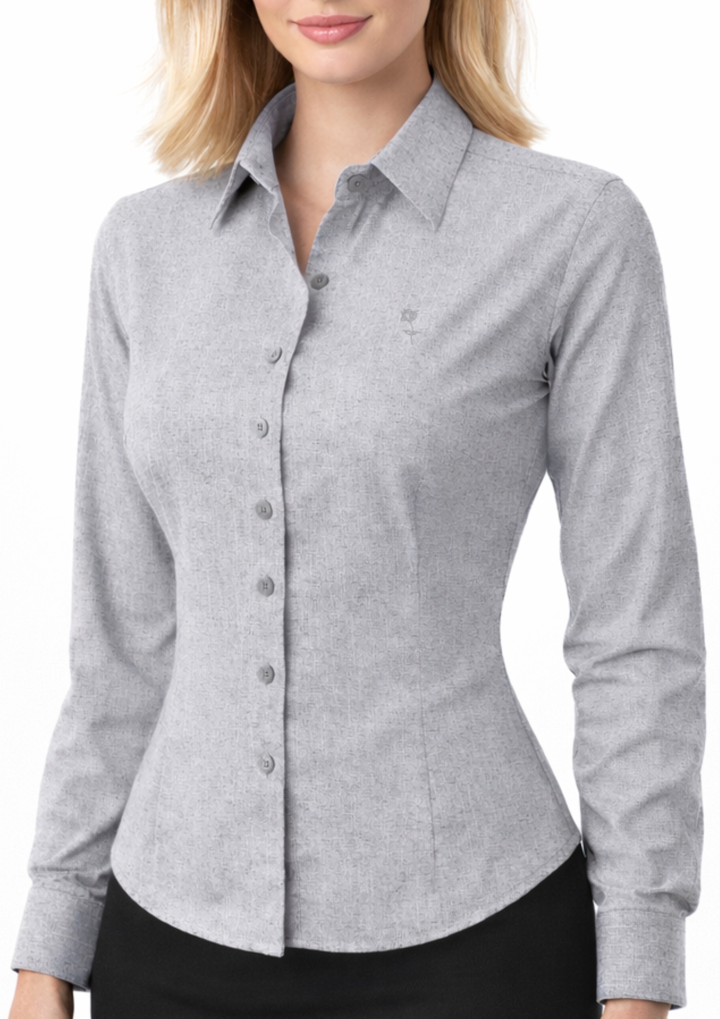 Camisa Social feminina manga longa, slim fit, cor cinza, estilo casual chique, feita em tecido leve de puro algodão, camisa elegante, moderna e sofisticada. Clássico e atemporal, Coleção Prime Flor.