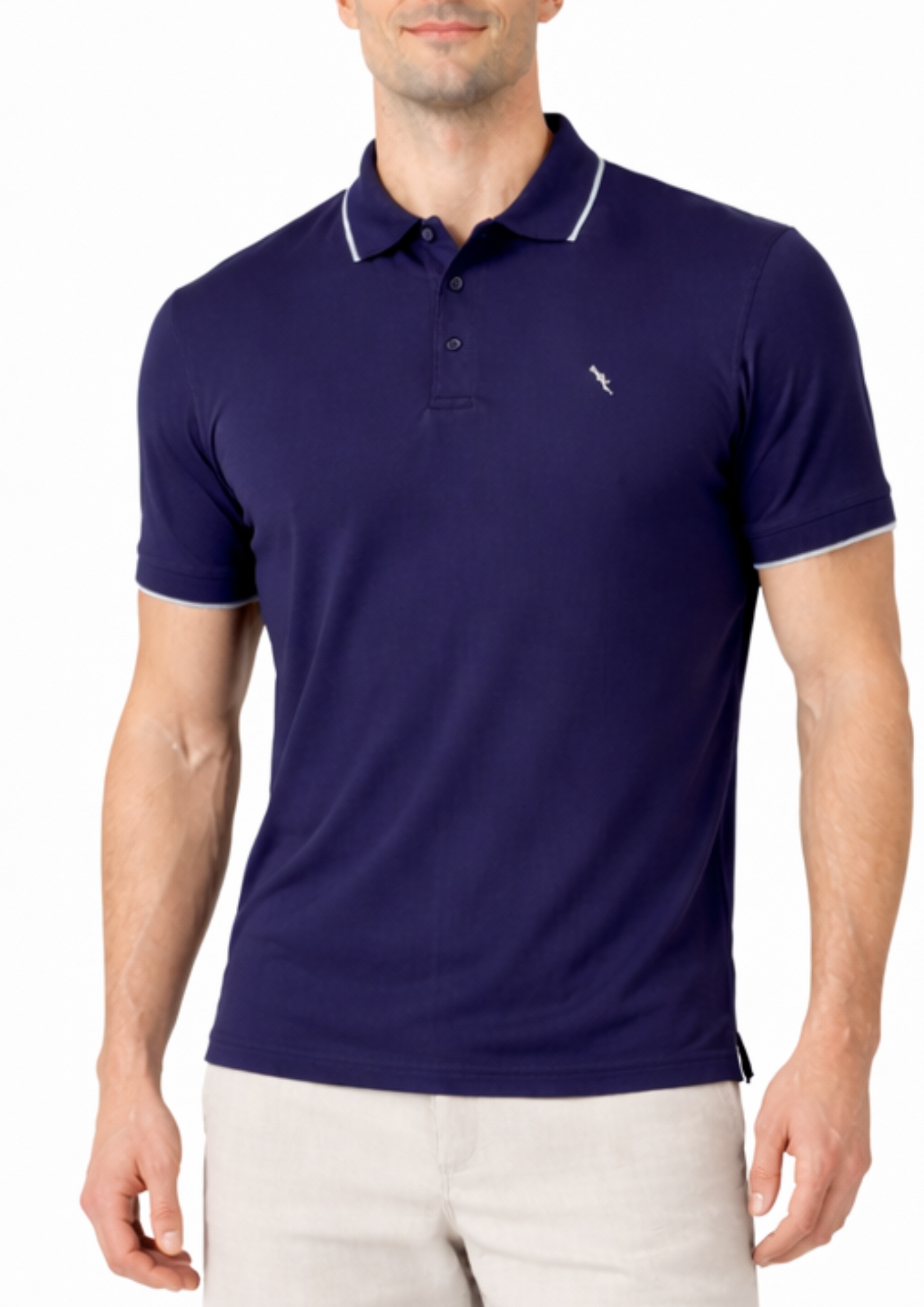 Polo 100% algodão 30.1 penteado, não cria bolinha, cor azul marinho, frisos da gola e punhos na cor cinza, toque macio, abertura lateral, coleção elegance arara.